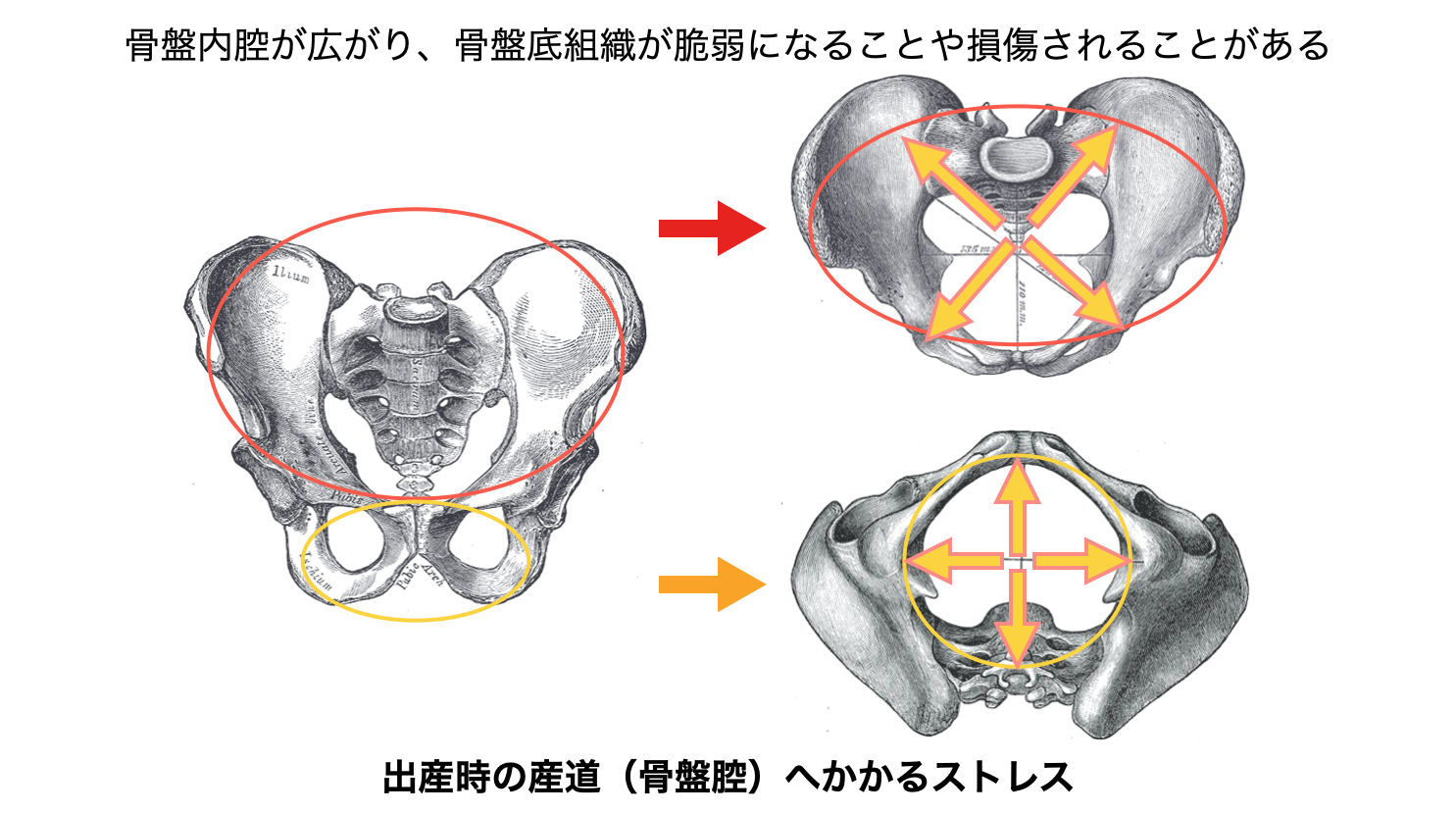 この部位に骨盤ベルトを装着することで、骨盤底を閉じる方向に力が加わり、骨盤の底からの支えを骨盤ベルトが補強してくれます。
