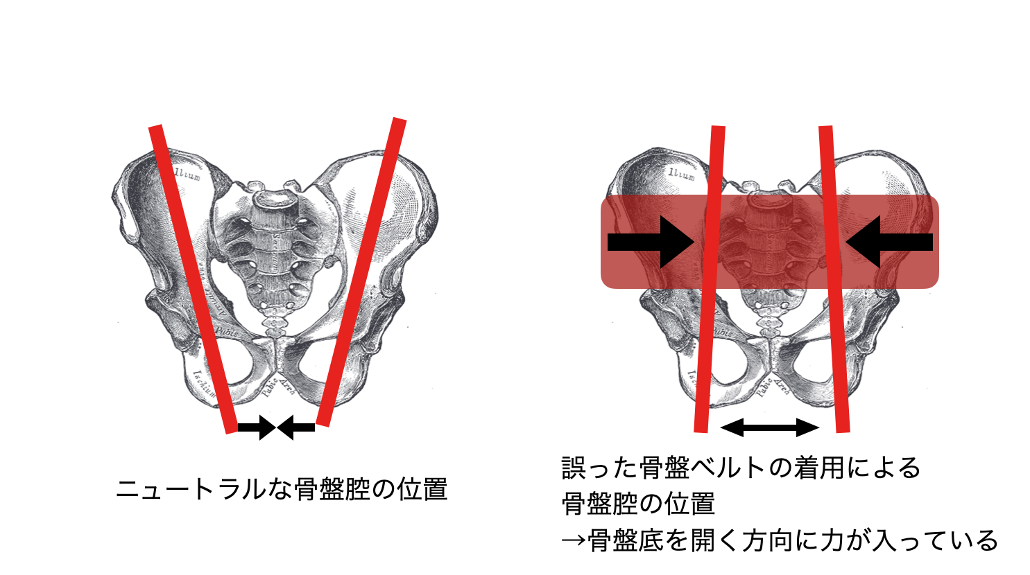上の図のようの誤った骨盤ベルトの装着場所では骨盤底が開く方向に力が加わってしまい安定性が逸脱してしまいます。